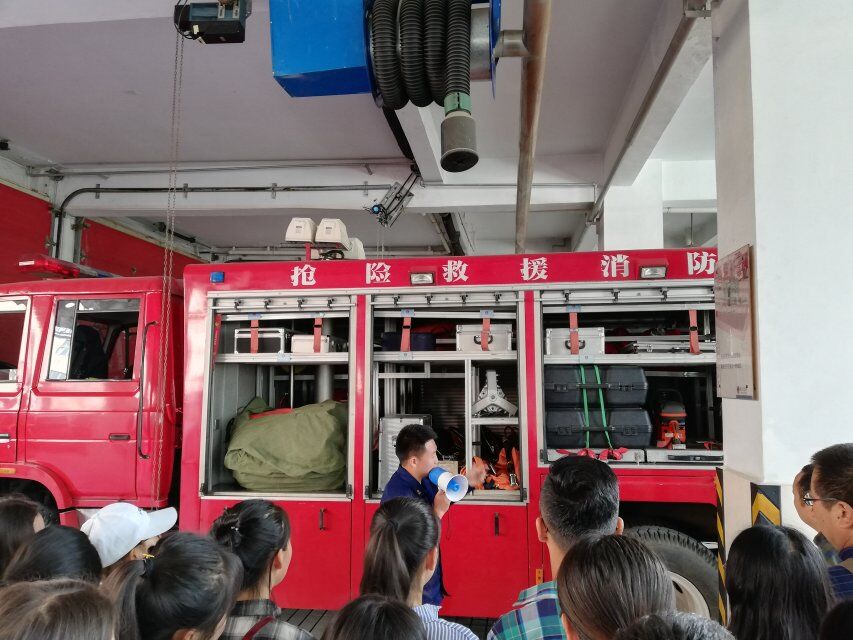 在参观过程中,消防队指导员对全体师生讲解了消防器材的使用,演示了出警的过程。部分老师和员工身着消防服,头戴消防帽,登上消防车,亲身体验消防官兵的真实生活,最后,集体观看了消防教育警示片。